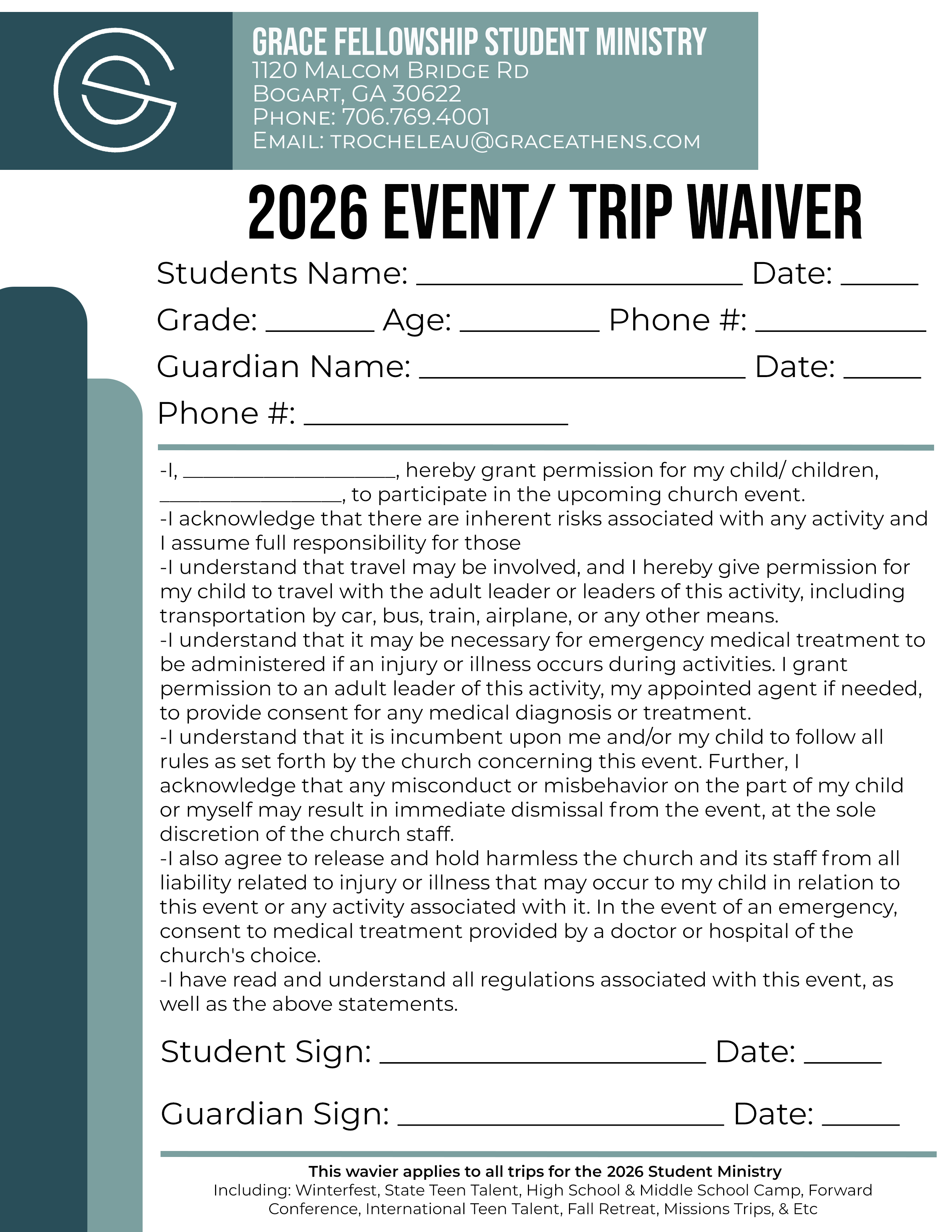 Camp Legacy 2026 is more than just a summer trip—it’s a week set apart for students to encounter God, build real friendships, and grow in their faith in a powerful way. Through worship, teaching, and intentional time away from the normal routine, students experience moments that stay with them long after camp ends. Full camp details will be released in early May, but spots are limited and fill up quickly each year. The cost is $200—secure your student’s spot today and don’t miss what God is going to do at Camp Legacy 2026. For any questions, please see or email Pastor